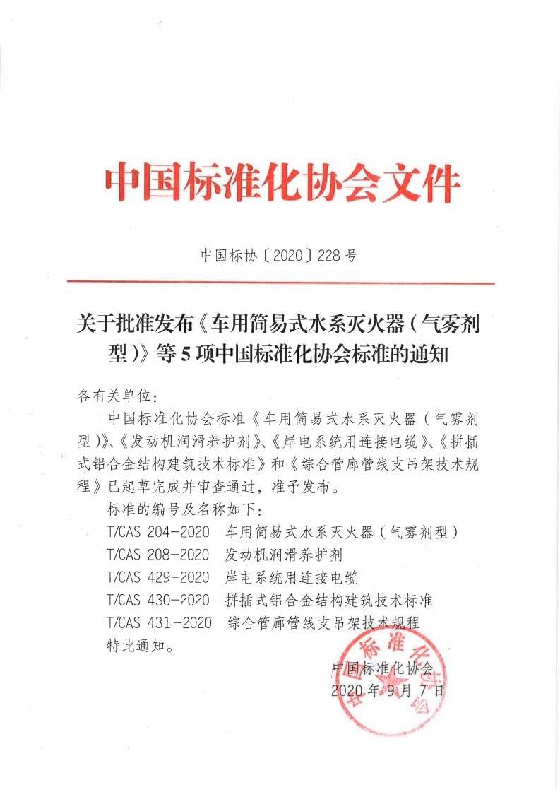 2020-228关于批准发布《车用简易式水系灭火器(气雾剂型)》等5项中国标准化协会标准的通知
