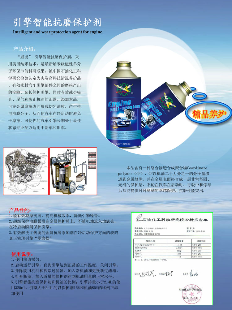 “威凌” 引擎智能抗磨保护剂,是美国纳米技术,新纳米级磁性单分子环保节能科研成果,被中国石油化工科学研究检验认定为尖端高科技清洗养护品。有效密封汽车引擎部件之间的磨损产出的空隙。延长保护引擎,同时有效减少噪音、尾气和防止机油的泄露。添加本品,可在金属摩擦表面形成均匀油膜,产生带电油膜分子,从而使汽车在冷启动避免干摩擦,可使你的汽车引擎长期处于好的状态。专业配方适用于新车和旧车。
