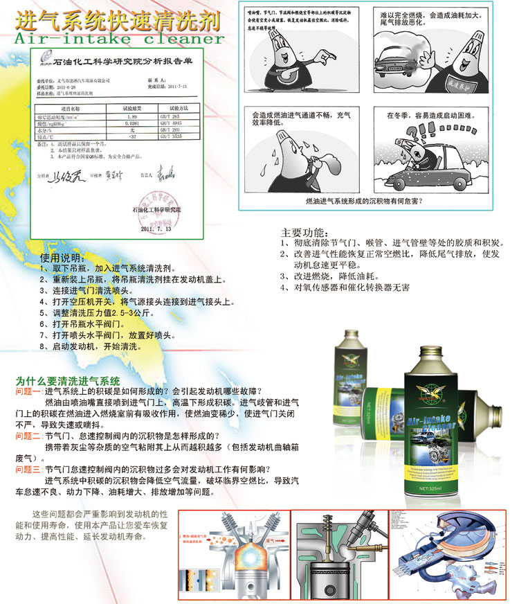 “威凌” 进气系统快速清洗剂,是美国纳米技术,新纳米级磁性单分子环保节能科研成果,被中国石油化工科学研究检验认定为尖端高科技清洗养护品,本产品能彻底清洗发动机进气管路,包括节气门、节气阀和燃烧室等部位的积碳等沉淀物,改善进气性能,恢复正常空燃比,使发动机怠速更平稳,可改进燃烧,降低油耗迅速恢复发动机性能,明显改善尾气的排放,对氧传感器和催化转换器无害。