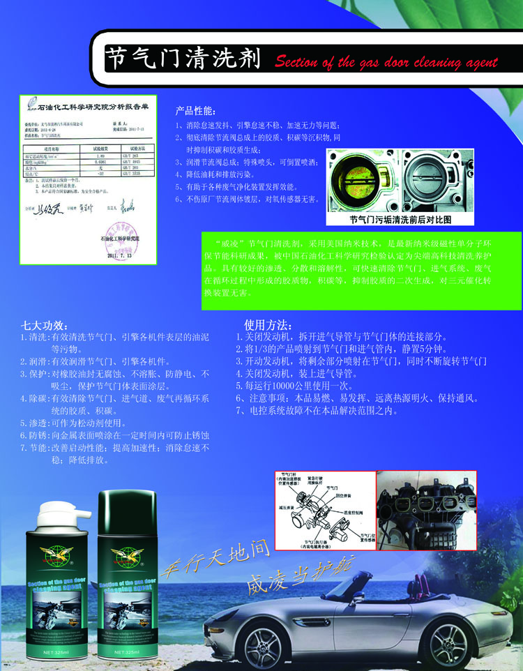 “威凌”节气门清洗剂,是美国纳米技术,新纳米级磁性单分子环保节能科研成果,被中国石油化工科学研究检验认定为尖端高科技清洗养护品。具有较好的渗透、分散和溶解性,可快速清除节气门、进气系统、废气在循环过程中形成的胶质物,积碳等,抑制胶质的二次生成,对三元催化转换装置无害。