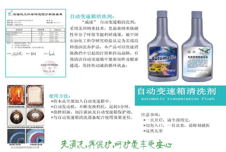 “威凌” 自动变速箱清洗剂,是美国纳米技术,最新纳米级磁性单分子环保节能科研成果,被中国石油化工科学研究检验认定为尖端高科技清洗养护品,本产品可以快速消除换挡中引起的打滑和抖动故障;有效清洁自动变速箱中紧密部件及精密通道,保持传动液的循环状态;