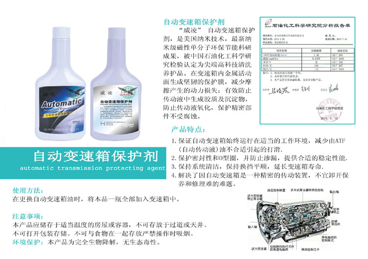 “威凌” 自动变速箱保护剂,是美国纳米技术,最新纳米级磁性单分子环保节能科研成果,被中国石油化工科学研究检验认定为尖端高科技清洗养护品。在变速箱内金属活动面生成坚韧的保护膜,减少摩擦产生的动力损失;有效防止传动液中生成胶质及沉淀物,防止传动液氧化,保护精密部件不受腐蚀。