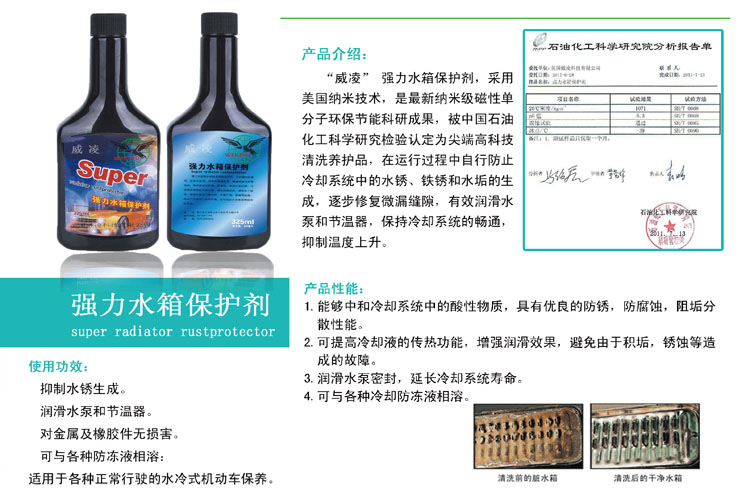 “威凌” 强力水箱保护剂,是美国纳米技术,最新纳米级磁性单分子环保节能科研成果,被中国石油化工科学研究检验认定为尖端高科技清洗养护品,在运行过程中自行防止冷却系统中的水锈、铁锈和水垢的生成,逐步修复微漏缝隙,有效润滑水泵和节温器,保持冷却系统的畅通,抑制温度上升。